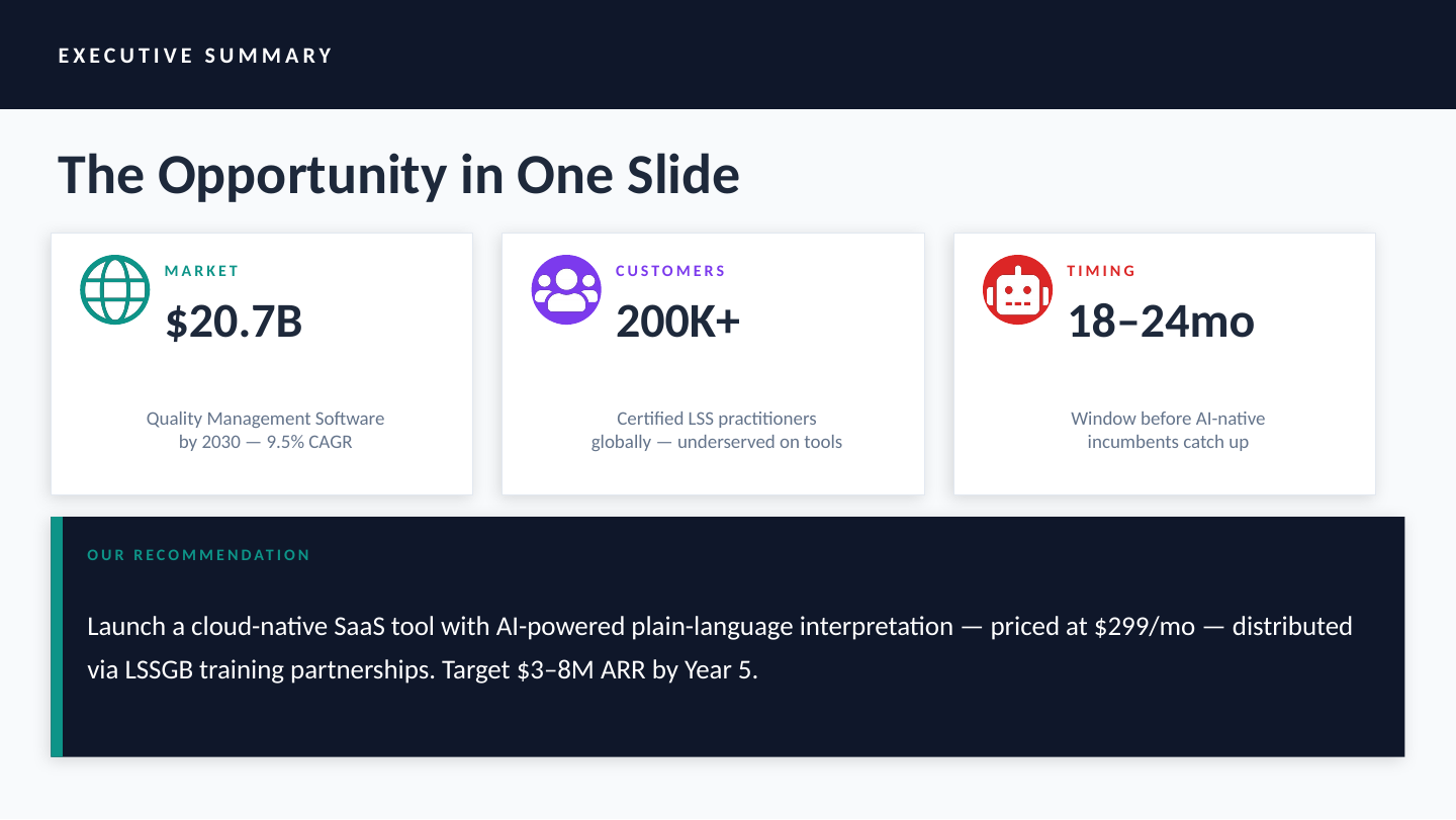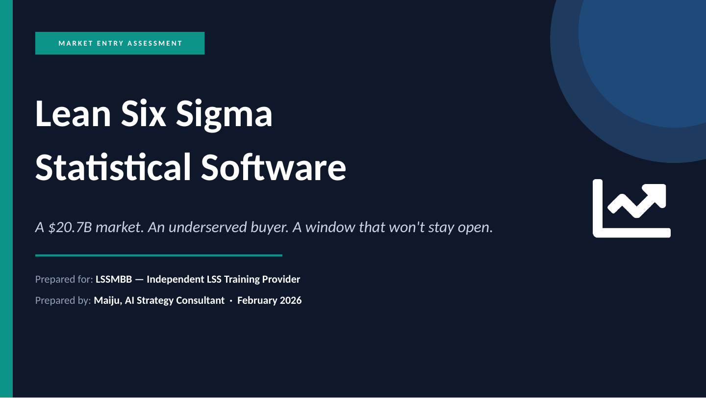 A professional market entry assessment for a new Lean Six Sigma statistical software product. 12 slides. Built from scratch with AI.