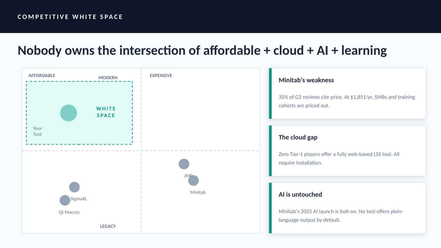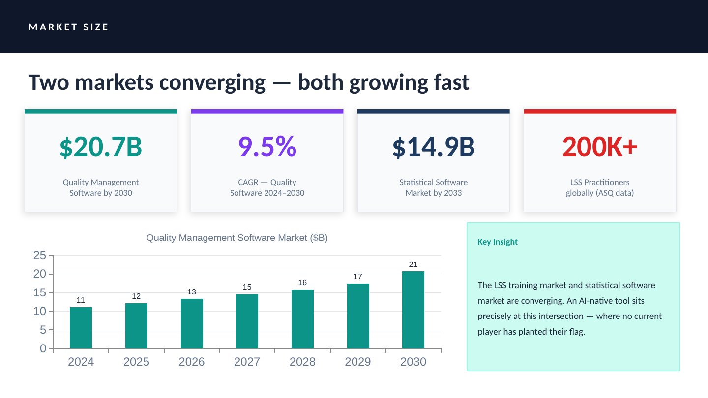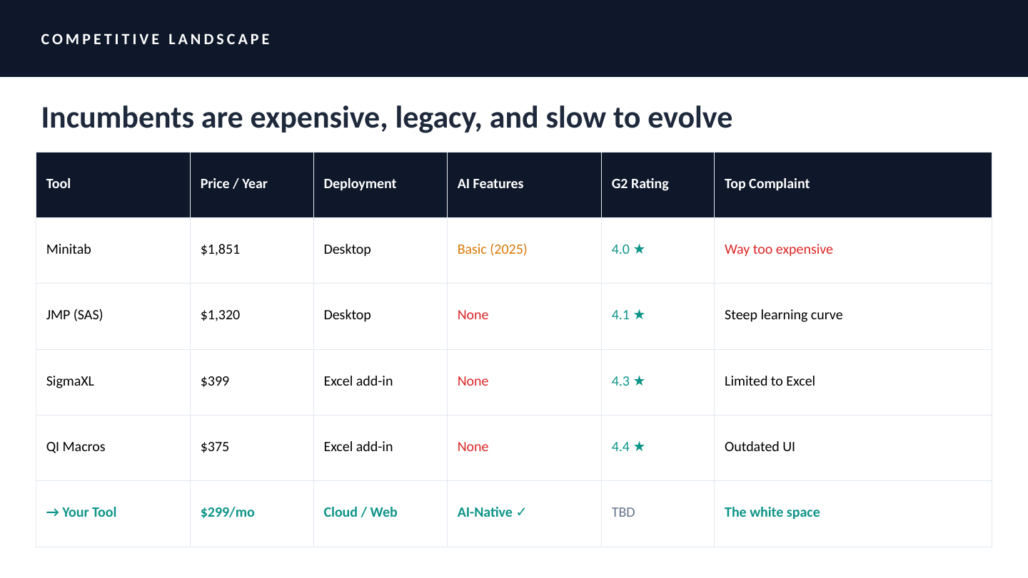 “Is there a defensible, monetizable market opportunity for a new LSS statistical analysis software — and if so, what does the winning product and strategy look like?”
