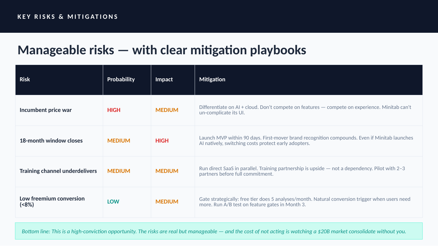 | H3 | There is no dominant browser-based, AI-assisted LSS statistical tool on the market | Medium | Critical |